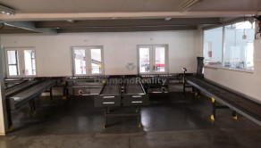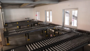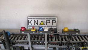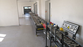 Valčekový dopravník chystaného tovaru v prepravkách od rakúskej firmy KNAPP v dĺžke cca 150 metrov. / 8 zastávok, hrebeňové ukončenie na expedícií podľa rozvozných smerov/ .