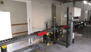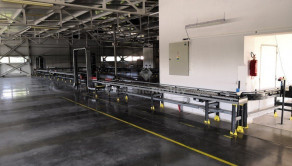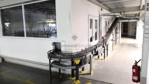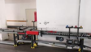 Valčekový dopravník chystaného tovaru v prepravkách od rakúskej firmy KNAPP v dĺžke cca 150 metrov. / 8 zastávok, hrebeňové ukončenie na expedícií podľa rozvozných smerov/ .