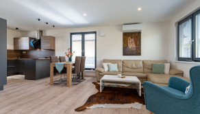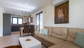 O komfortné teplo v celom dome sa stará podlahové kúrenie, ktoré si vďaka samostatným termostatom môžete nastaviť v každej izbe individuálne. V chladnejších mesiacoch určite oceníte aj krb, ktorý dodá interiéru príjemnú atmosféru. V obývacej časti je navyše umiestnená klimatizácia, ktorá sa postará o pohodlie počas horúcich dní.