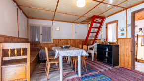 Sedenie a stolovanie: stôl s drevenými stoličkami a drevená vyrezávaná lavica, ktorá poskytuje dostatok miesta na sedenie.