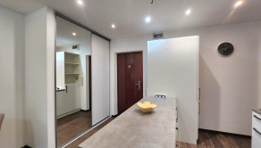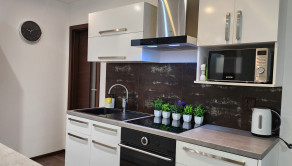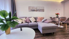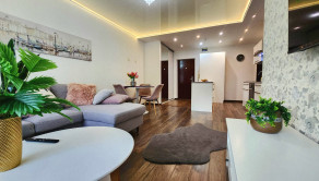 Byt prešiel KOMPLETNOU rekonštrukciou a je zariadený v elegantnom Glamour štýle. Ponúka množstvo úložného priestoru vďaka vstavaným skriniam, veľkú kuchynskú linku a moderné riešenia ako zabudovaná chladnička či elektrické zásuvky priamo v pracovnej doske. Samozrejmosťou je plná vybavenosť – práčka, umývačka riadu, chladnička, vysávač, žehliaca doska aj kompletný kuchynský riad.